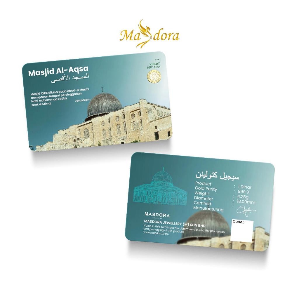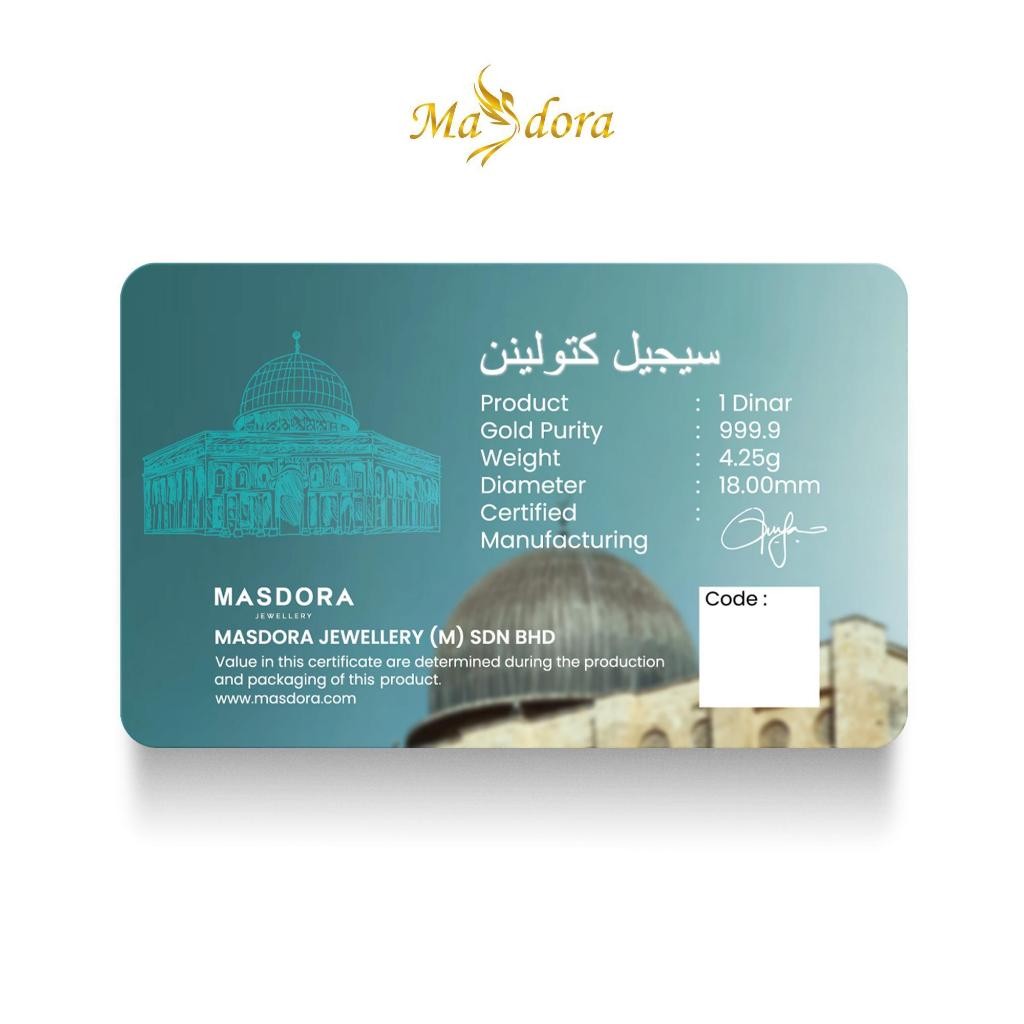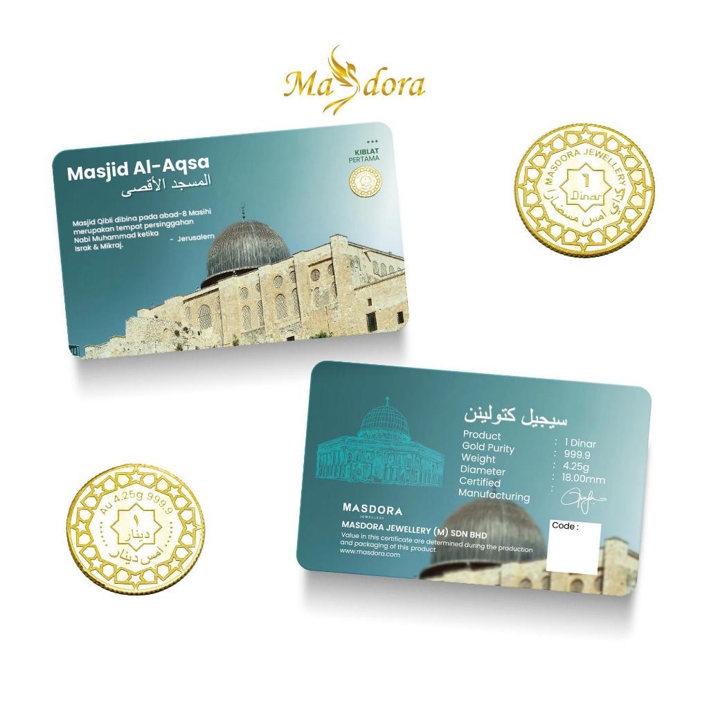 -The Haji 1 Dinar from MASDORA’s Haji Collection is a distinguished piece of fine gold. With its 99.99% purity and elegantly designed card featuring Masjid Al Aqsa, this 1 Dinar coin makes a meaningful and luxurious gift. Its exquisite craftsmanship and symbolic design celebrate the significance of Haji.