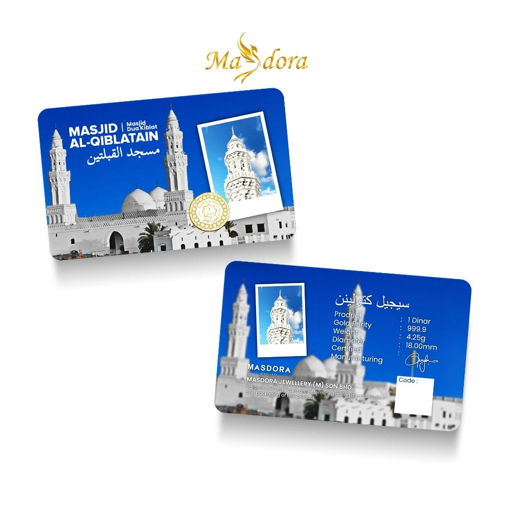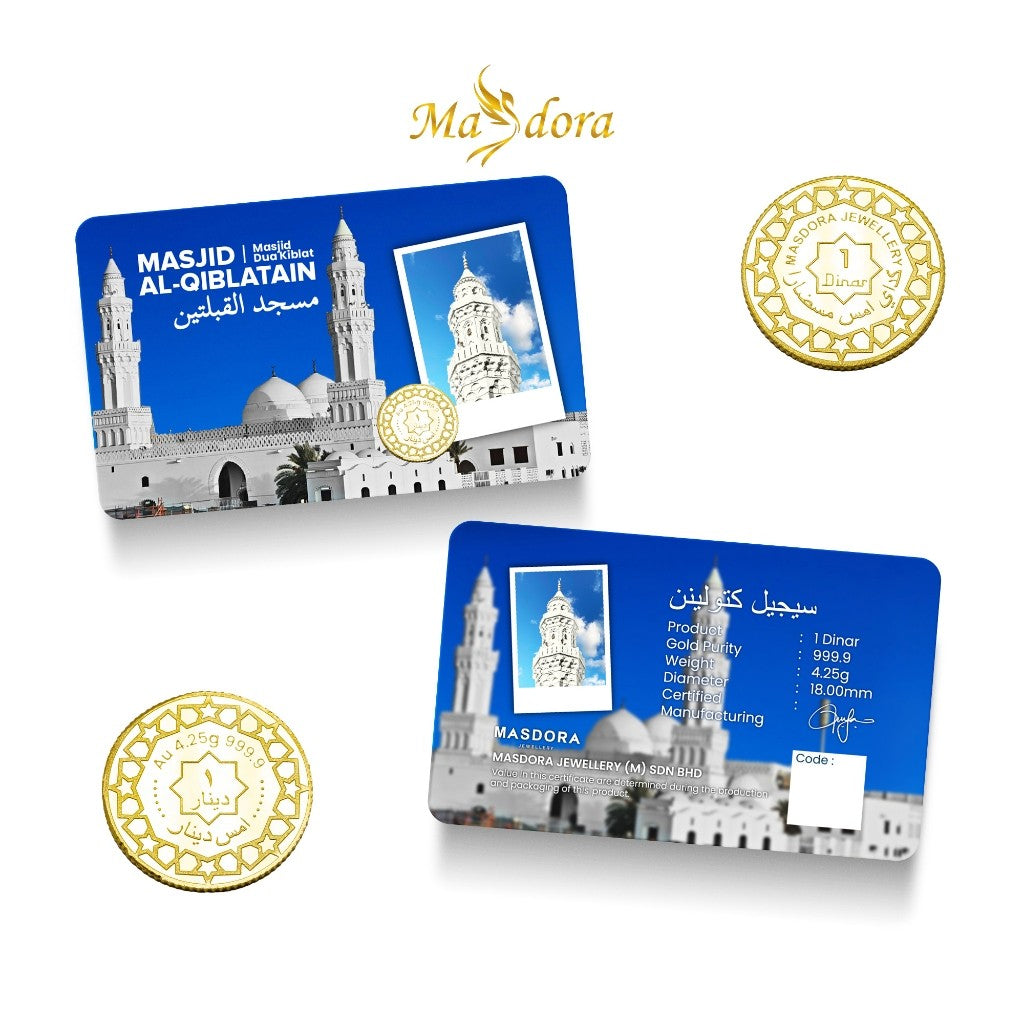 -This exquisite 1 Dinar from the Umrah Collection celebrates the sacred journey with a detailed depiction of Masjid Al-Qiblatain. Crafted from 99.99% fine gold, it serves as a meaningful token of faith and devotion.