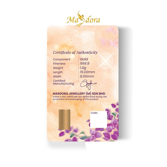 -The MASDORA 999.9 Gold Bar 1.00GM Flower Series - Bougainvillea features a beautifully designed gold bar with an intricate Bougainvillea flower motif. Crafted from 999.9 fine gold, this piece represents both elegance and quality. Its compact size makes it an exquisite addition to any collection or a thoughtful gift for special occasions. With its fine craftsmanship and timeless design, it stands out as a symbol of luxury and sophistication.
