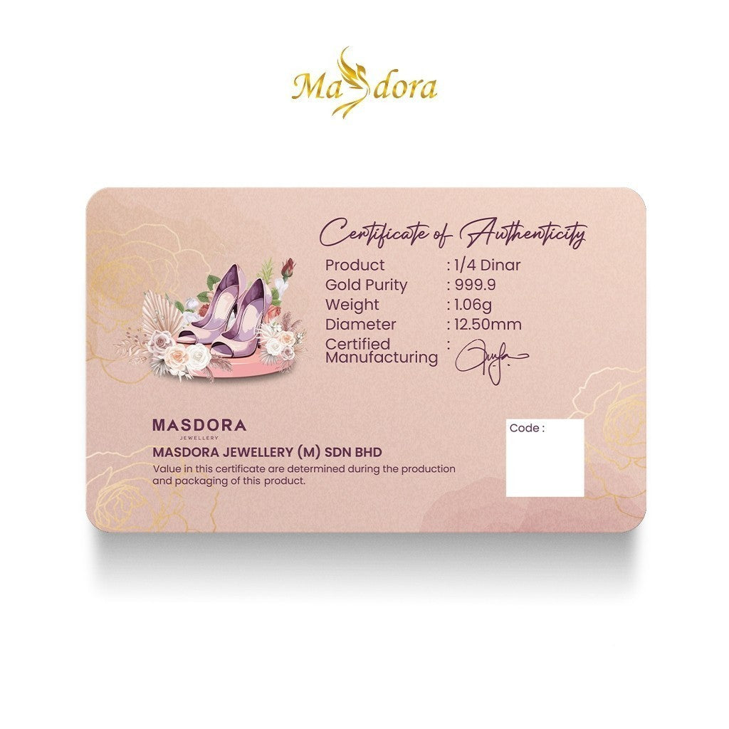 -The MASDORA 999.9 Gold 1/4 Dinar from the Hantaran Collection features a charming design inspired by traditional wedding shoes, making it a unique and thoughtful gift for wedding ceremonies. Crafted from pure 24K gold, this dinar symbolizes love and celebration.