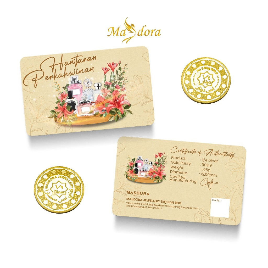 -The MASDORA 999.9 Gold 1/4 Dinar from the Hantaran Collection features a charming design inspired by perfumes, making it a delightful gift for weddings and special occasions. Crafted from pure 24K gold, this dinar symbolizes elegance and appreciation.