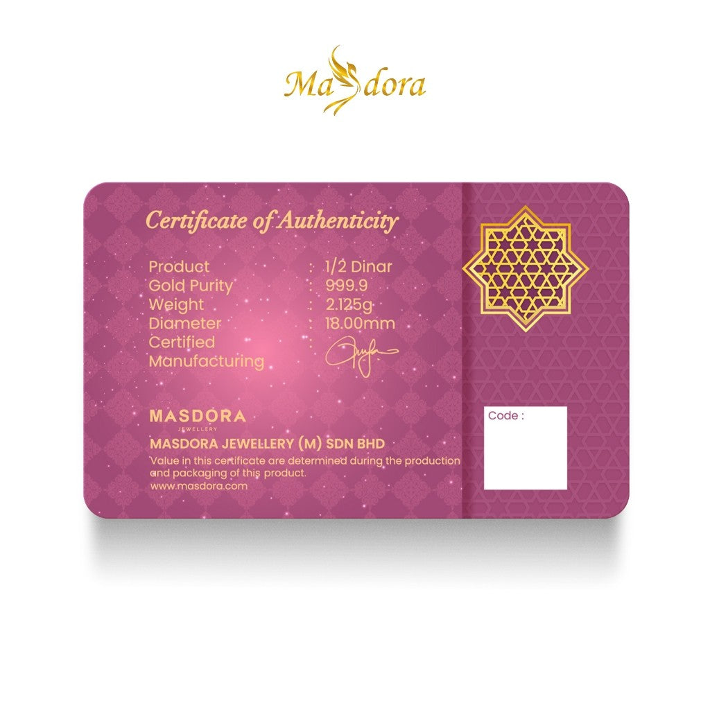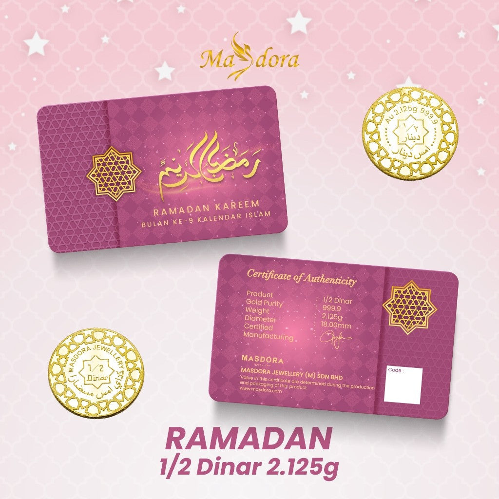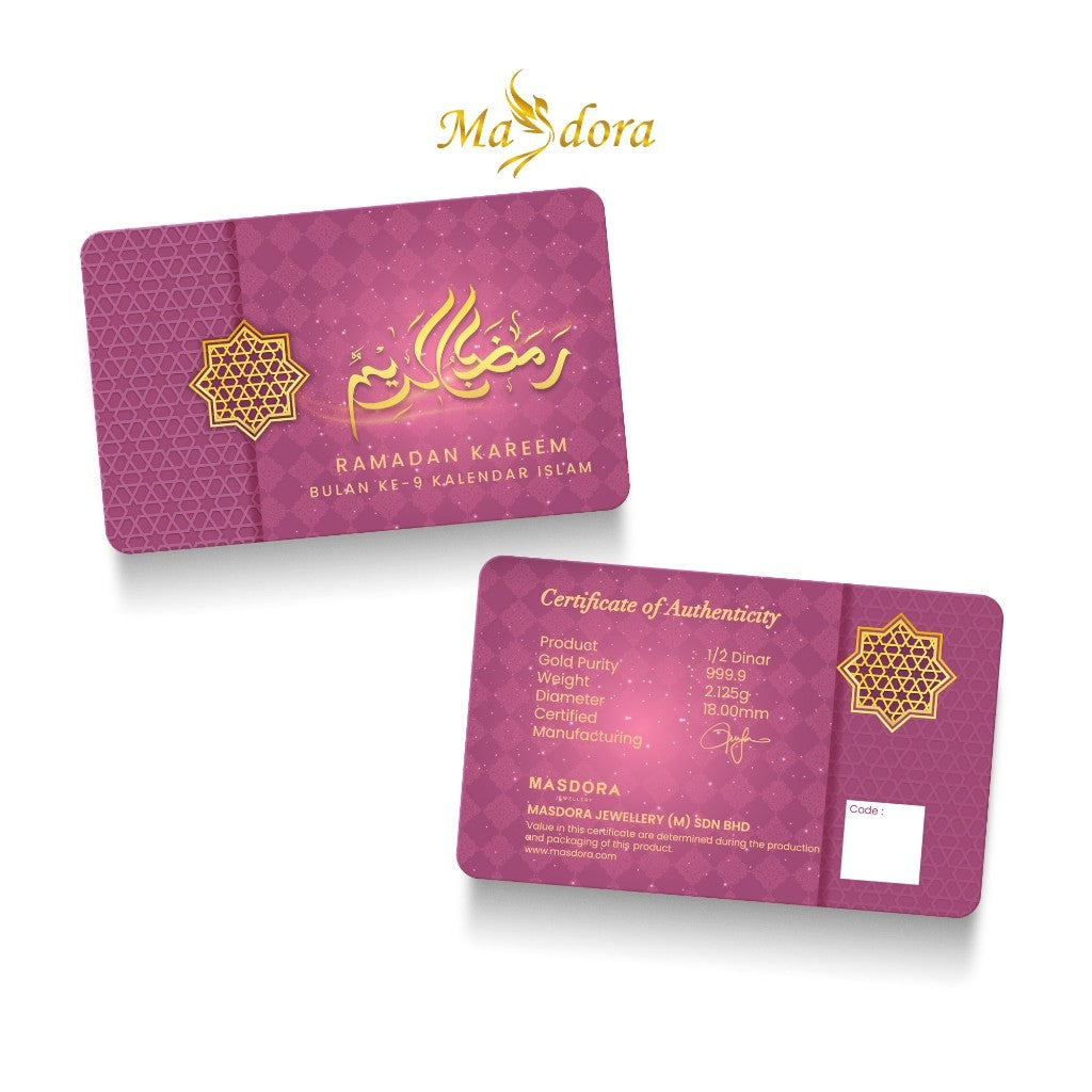 -The MASDORA 999.9 Gold 1/2 Dinar celebrates the holy month of Ramadan, making it a thoughtful and meaningful gift. Crafted from pure 24K gold, this dinar features a design that beautifully represents the Islamic calendar.